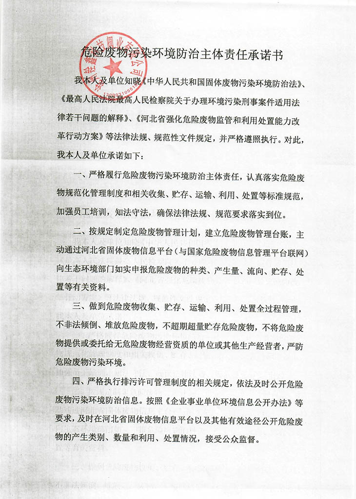 危险废物污染环境防治主体责任承诺书